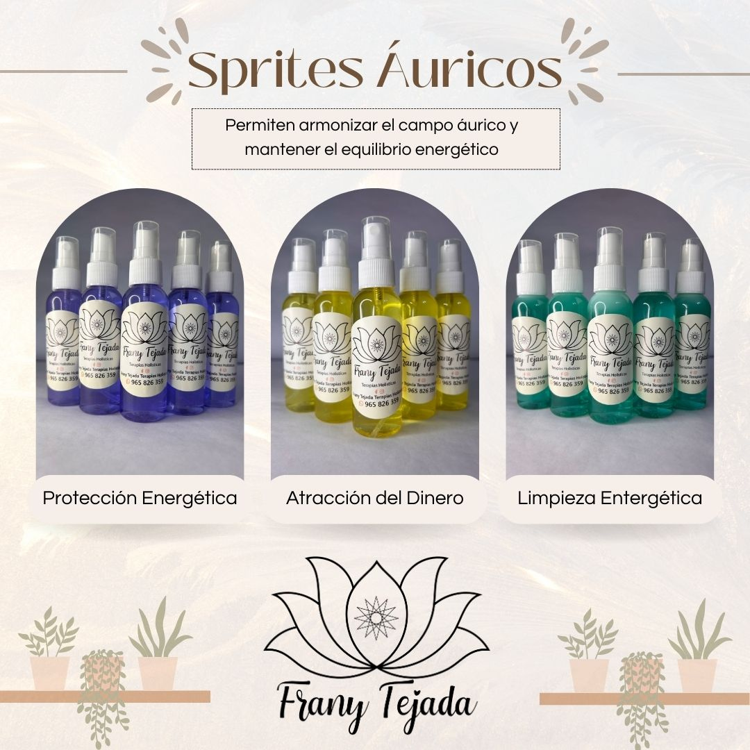 Los Sprites Áuricos de Frany Tejada Terapias Holísticas están diseñados para ayudar a armonizar el campo áurico y mantener el equilibrio energético.