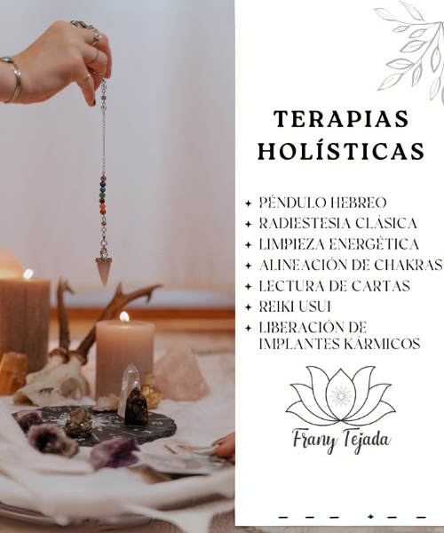 Explora una variedad de terapias holísticas diseñadas para armonizar tu energía y promover el bienestar integral. Frany Tejada te ofrece técnicas como el Péndulo Hebreo,